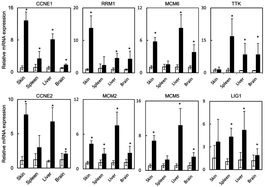 E2F target genes are induced in different organs of RosaHPV mice treated with TAM. The skin, spleen, liver, and brain from RosaHPV mice treated with TAM (filled bars) or vehicle (open bars) subjected to qRT-PCR for the E2F target genes CCNE1, RRM1, MCM6, TTK, CCNE2, MCM2, MCM5, and LIG1. Data from tissues isolated from five mice per group and assayed in duplicate. * denotes p < 0.01. Error bars represent SD. p values determined by Student’s t-test.