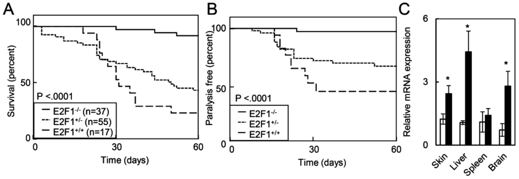 Loss of E2F1 has been previously shown to extend the survival of RB1 deficient embryos from embryonic day 13 to embryonic day 17.5 [19]. Given that HPV oncogenes induced expression of E2F1 target genes, we assessed how E2F1 loss impacted the survival of RosaHPV mice after TAM treatment. Compared to RosaHPV mice with intact or heterozygous loss of E2F1, homozygous loss of E2F1 increased the median survival of RosaHPV mice after TAM treatment (Figure 4A). (Median survival: RosaHPV-E2F1−/−: not reached; RosaHPV-E2F1+/−: 49 days; RosaHPV-E2F1+/+: 30 days; p < 0.0001.) Furthermore, fewer RosaHPV-E2F1−/− mice displayed gait abnormalities or paralysis compared to RosaHPV-E2F1+/− mice or RosaHPV-E2F1+/+ mice (p < 0.0001; Figure 4B). To determine if E2F1 dependent lethality was determined by tissue-specific differences in E2F1 gene expression, we assessed E2F1 gene expression in the skin, spleen, liver, and brain in RosaHPV mice treated with vehicle or TAM. We observed induction of E2F1 gene expression after TAM treatment in the skin, spleen and brain suggesting that tissue-specific lethality of HPV oncogene expression is unlikely to be due to differences in E2F1 gene induction. Therefore, E2F1 mediates lethality caused by HPV oncogenes in adult mice.