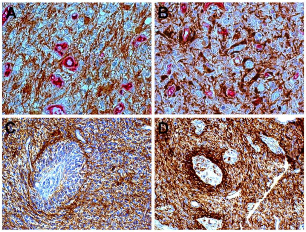 Glioblastoma. Close relationship of Nestin+ cells with small vessels (A), but not with GFAP cells (B); DAB, ×400; Ring of tumor cells around a vessel: the inner cells are Nestin+ (C) and GFAP+ cells are external (D), DAB, ×200.