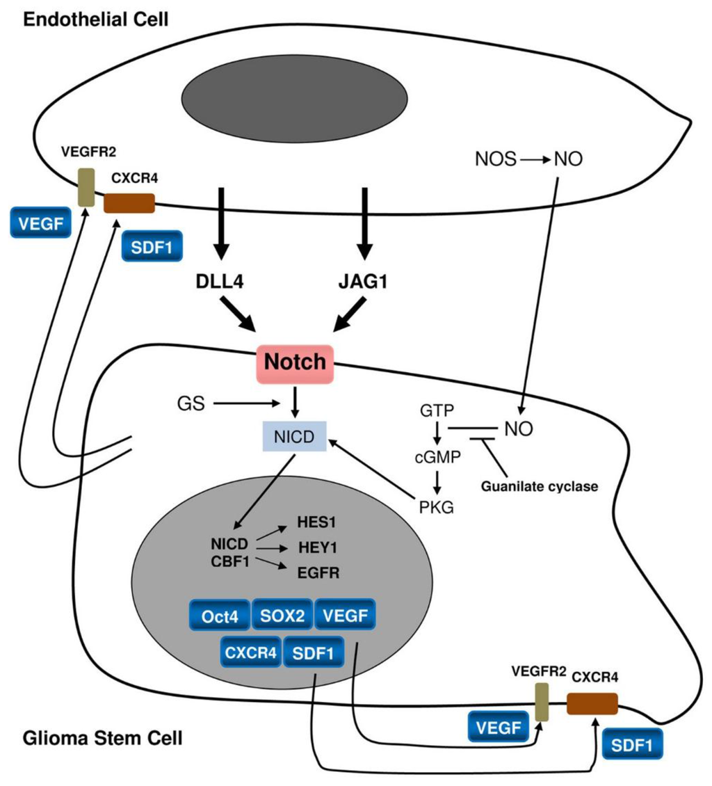 Hypoxia, a mechanism of primary importance in the biology and aggressive behavior of malignant gliomas [25], is fundamental in PNN. It is critically involved in the regulation of GSCs [8] of which it promotes the expansion through the phosphatidylinositol 3 kinase (PI3K)/Akt and ERK1/2 pathways; the inhibition of the latter reduces the number of GSCs [26]. The mechanism of GSC promotion still consists in Notch activation through its ligands and the final activation of target genes Hes1 and Hey1 [8,27] (Figure 2). This has been confirmed by the blockade of Notch by γ-secretase inhibition that reduces the expression of stemness antigens such as Nestin, CD133, Bmi1 and inhibits in vitro neurosphere formation and xenographts [28]. Hypoxia is a feature of the entire GBM, but it is particularly evident where circumscribed necroses develop and where it induces key stem cells genes such as Nanog, Oct4 and c-Myc [29]. GSCs are in fact well demonstrable not only in perinecrotic palisadings, but also in cells scattered in the proliferating tumor [7,8]. In the signaling that occurs in niches all pathways that regulate tumor progression and transformation and other processes are included, such as epidermal growth factor receptor (EGFR) gene amplification, phosphatase and tensin homolog (PTEN) mutation, PI3K/Akt, bone morphogenetic proteins (BMP), loss of heterozygosity (LOH) on critical chromosomal regions, etc., as well as the intrinsic signaling such as Wnt/β-catenin, Bmi1, c-Myc, Oct4, OLIG2, Sonic Hedgehog (SHH), and Notch.