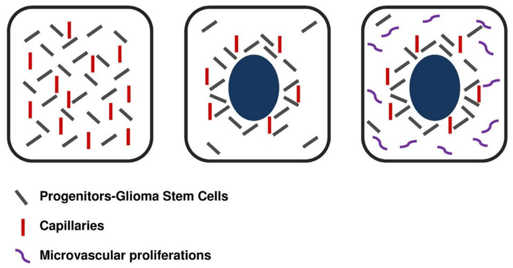 Any regulation of tumor cells towards regression, such as necrosis, or progression, such as proliferation, invasion and angiogenesis, finds its main driver in the microenvironment that mainly expresses itself in the so-called niches [3,4,5]. As a matter of fact, in glioblastoma multiforme (GBM), niches are regarded as the crucial points where microenvironment exerts influence, since they are the sites where glioblastoma stem cells (GSCs) are believed to reside, be maintained or originate and where the signaling arising in stromal and in tumor cells converges to regulate tumor features. Niches can be perivascular (PVN) or perinecrotic (PNN). The former have been conceived as simply represented by endothelial cells associated with Nestin+ and CD133+ stem cells, which condition angiogenesis and tumor growth [6], or as more complicated structures including, beside tumor stem cells, endothelial cells, astrocytes, fibroblasts, macrophages, pericytes, non-stem tumor cells, and microglia [3] (Figure 1). GSCs have been demonstrated to occur in PVN by CD133 positivity [7] or by side population signature genes, aspartate beta-hydroxylase domain containing 2 (ASPHD2) or nuclear factor erythroid 2-like 2 (NFE2L2) or hypoxia-inducible factor 2 (HIF-2) [8]. Positivity to stemness antigens increases with malignancy [9]. C6 glioma xenografts with a high content of GSCs exhibit an increased microvessel density and an increased recruitment of bone marrow (BM)-derived endothelia progenitors [10].