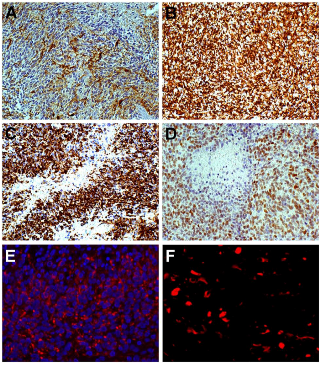 Glioblastoma. (A) Hyperproliferating area with scarce GFAP-positive cells, DAB, ×200; (B) Id. with abundant Nestin+ cells, DAB, ×200; (C) Circumscribed necrosis developing in a Nestin-rich hyperproliferating area, DAB, ×200; (D) Circumscribed necrosis developed in a SOX2-rich hyperproliferating area, DAB, ×200; (E) Most cells are Nestin+ in a perinecrotic palisade, immunofluorescence, ×400; (F) Nestin+ cells around a circumscribed necrosis, immunofluorescence, ×400.