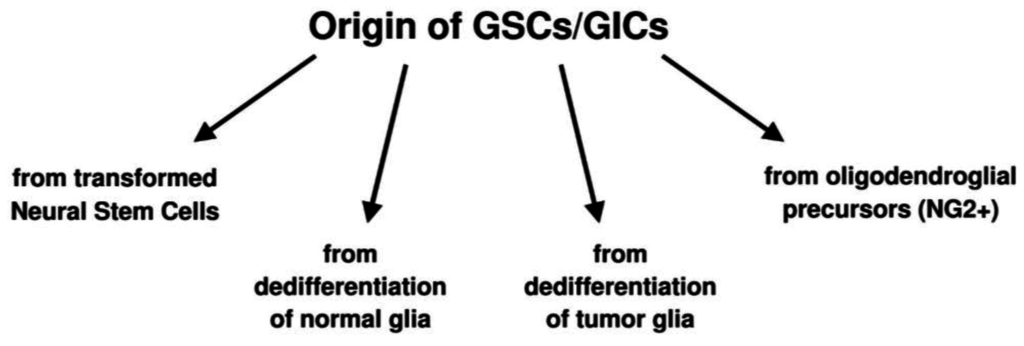 In the discussion of the tumor microenvironment, it is mandatory to consider the supposed origin of GSCs, i.e., by transformation of the normal neural stem cells (NSCs) and progenitors in relation with the so-called glioma initiating cells (GICs), the concept of which is just mentioned here. In line with the old belief that cancer cells are similar to embryonic stem cells [30], it has been established that glioma cells derive from immature glia [31,32], i.e., from primitive neuroepithelial cells or NSCs [33]. GICs share properties with NSCs [34,35,36], either in the sub-ventricular zone (SVZ) or during migration. GSCs, on the other hand, share genetic alterations with gliomas [37].
