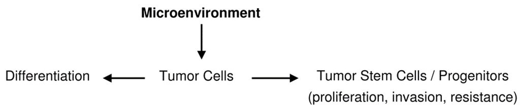 In conclusion, microenvironment by genetic and epigenetic mechanisms regulates the equilibrium between tumor stem cells and tumor non-stem cells so that the occurrence of GSCs would not imply the existence of a special type of cells, but it would be the consequence of an interplay that takes place in the microenvironment (Scheme 2). This would have therapeutic consequences, since the therapies directed to annihilate a fixed target such as GSCs as the responsible for growth, resistance and recurrence of the tumor should be converted into therapies aimed at molecular modifications of the microenvironment.