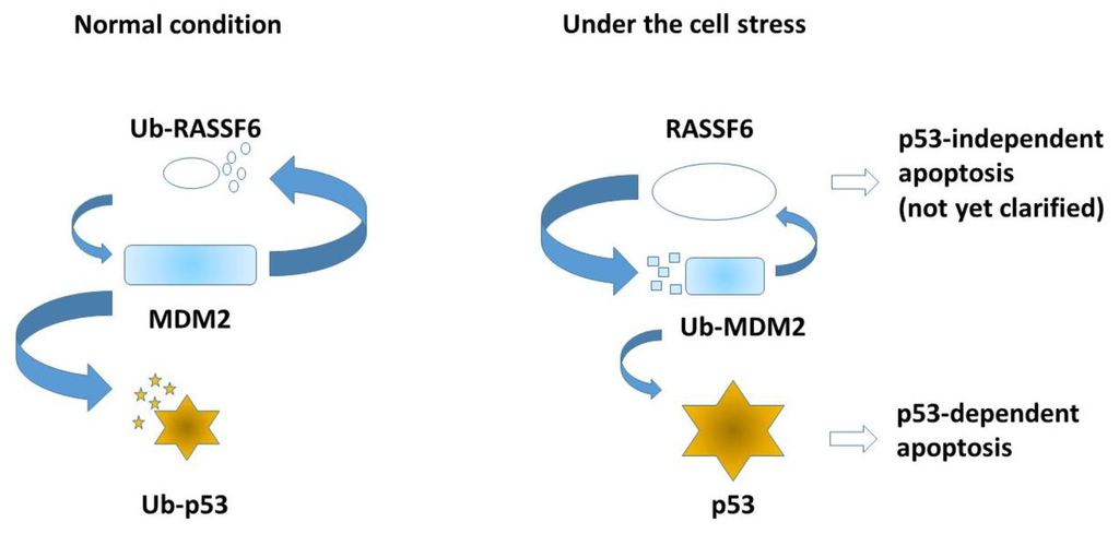 Under the normal condition, MDM2 degrades RASSF6 and p53. When cells are exposed to stress such as ultraviolet exposure, MDM2 self-ubiquitination is enhanced and p53 is stabilized. RASSF6 also induces apoptosis independently of p53, but the mechanism remains to be clarified. Small entities symbolize degradation of each ubiquitinated protein (Ub-RASSF6, Ub-p53, and Ub-MDM2).