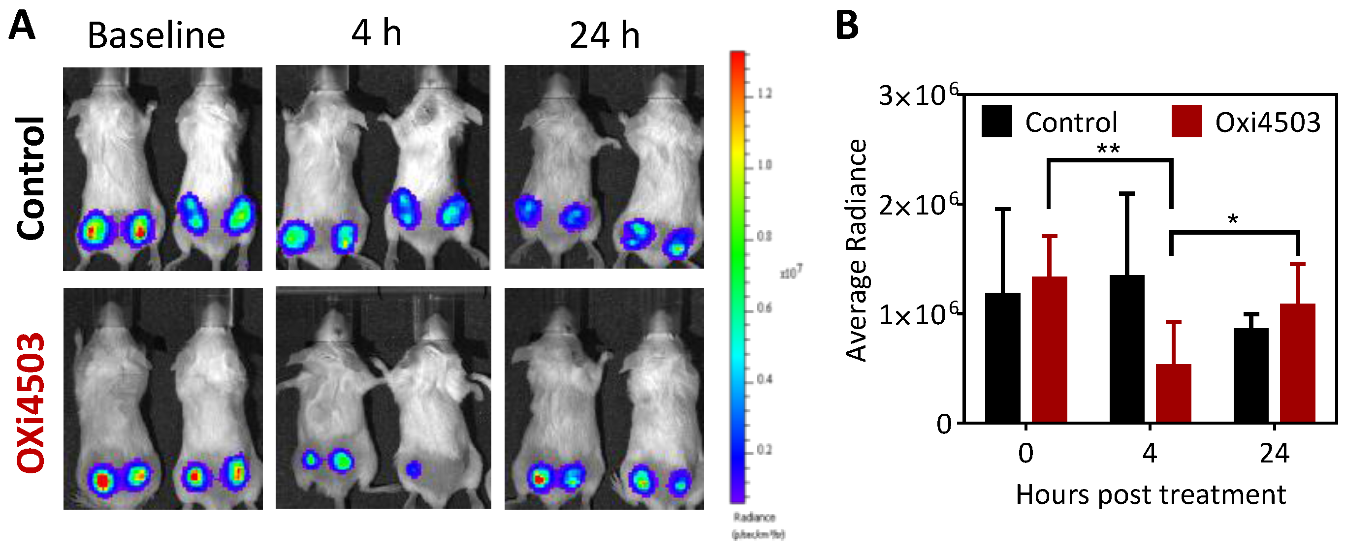 Temporal bioluminescence imaging (BLI) of FaDu-luc tumor response to OXi4503 treatment. (A) Panel of images represent pseudo-colorized bioluminescence images of mice in control and OXi4503 groups at baseline, 4 and 24 h post single dose vascular disrupting agent (VDA) (n = 4 controls; n = 6 treated); (B) Quantitative estimates of tumor radiance (mean ± standard deviation) for animals in both groups at the three time points. * denotes p < 0.05, ** denotes p < 0.01.