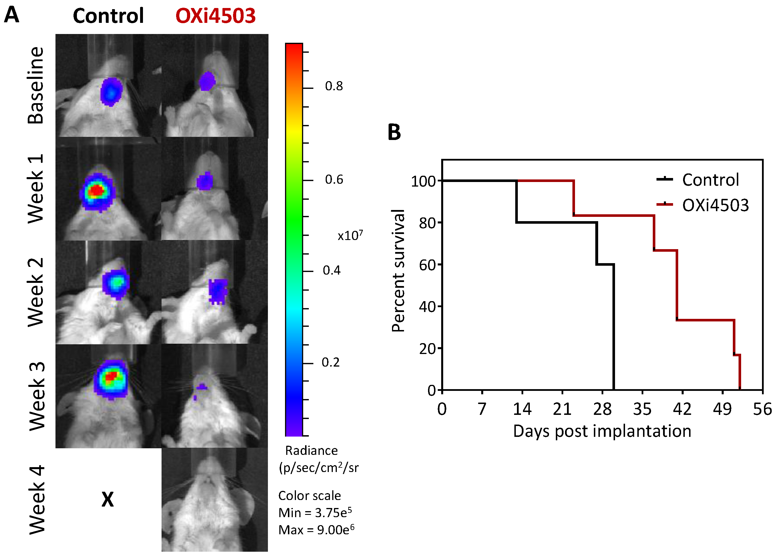 Long-term efficacy of OXi4503 against orthotopic FaDu-luc HNSCC xenografts. (A) Representative bioluminescence images of an untreated control and an OXi4503-treated mouse at baseline and following treatment; (B) Kaplan-Meier survival curves of control and OXi4503 treated animals. OXi4503 administered at a dose of 40 mg/kg, i.p. on days 6, 13 and 20 post implantation (n =5–6 per group).
