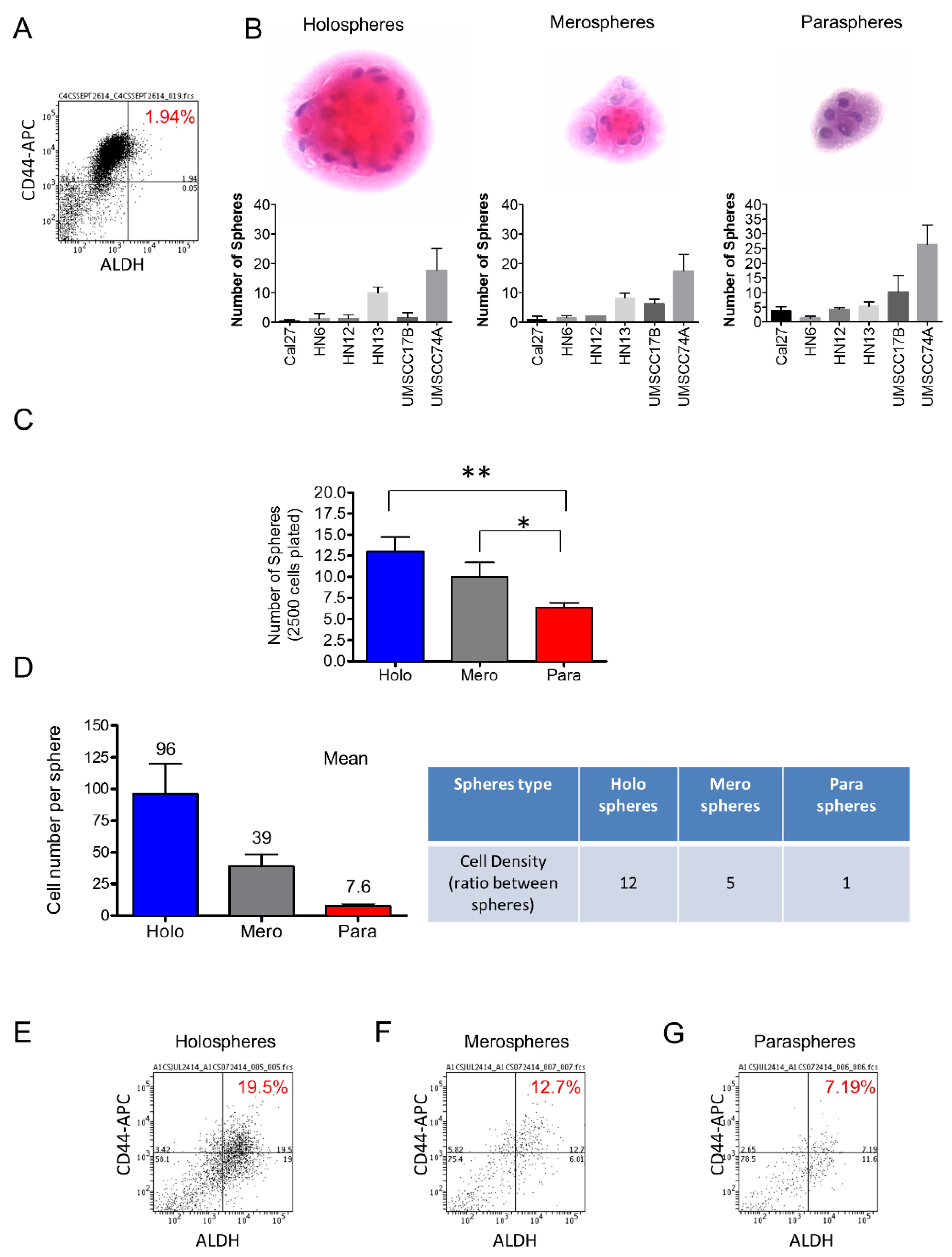 Ultra-low attachment culture conditions enhance the number of CSCs. (A) Cell sorting to determine the total number of tumor cells from an HNSCC cell line cultured in monolayer. N,N-diethylaminobenzaldehyde (DEAB) was used to inhibit ALDH activity resulting in the identification of negative cells for ALDH; (B) H and E staining of tumor spheres depicting the typical morphological appearance of holospheres, merospheres, and paraspheres. HNSCC tumor cell lines Cal7, HN6, HN12, HN13, UMSCC17B, and UMSCC74A are able to generate holospheres, merospheres, and paraspheres; (C) Total number of tumor spheres from a culture of 2.5 × 103 tumor cells under ultra-low adhesion conditions (** p < 0.01, * p < 0.05); (D) Mean of the total number of cells per sphere subtype and the ratio of cellular density between different spheres types; (E–G) Percentage of tumor cells positive for CD44 and ALDH stem cell markers.