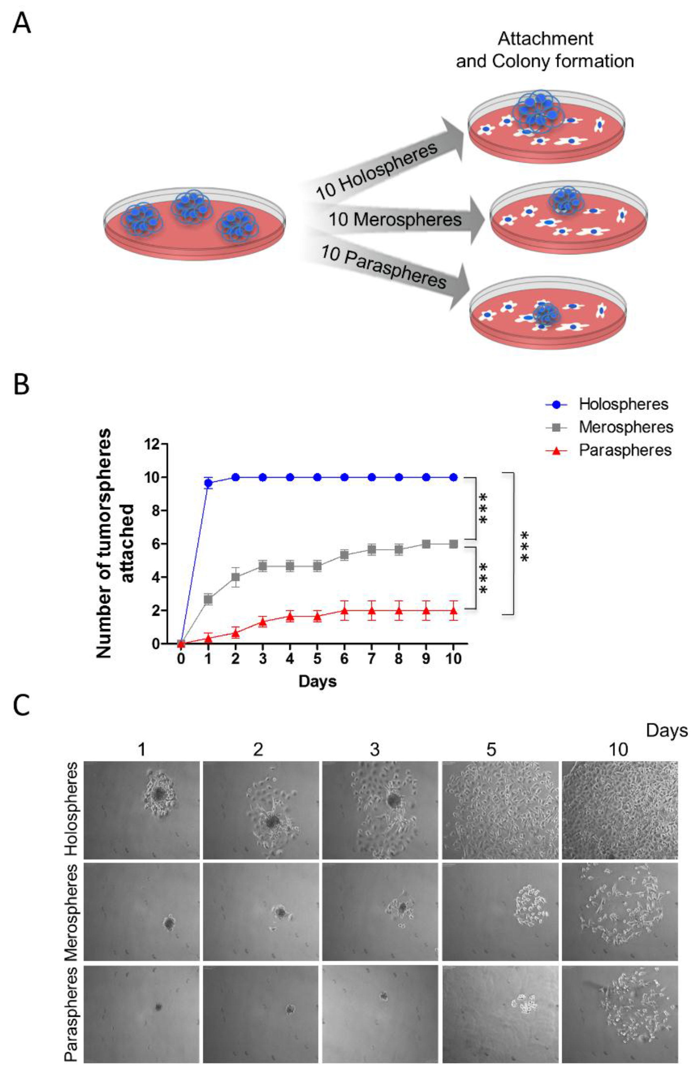 Increased reattachment and spreading of tumor cells from holospheres. (A) Schematic representation of tumor spheres (n = 10) isolated based on morphology (holospheres, merospheres, or paraspheres) and seeded into culture dishes (adherent culture conditions); (B) Time course and quantification of adhesion efficiency of tumor spheres (*** p < 0.001); (C) Representative examples of holospheres, merospheres, and paraspheres adhering and spreading in culture dishes.