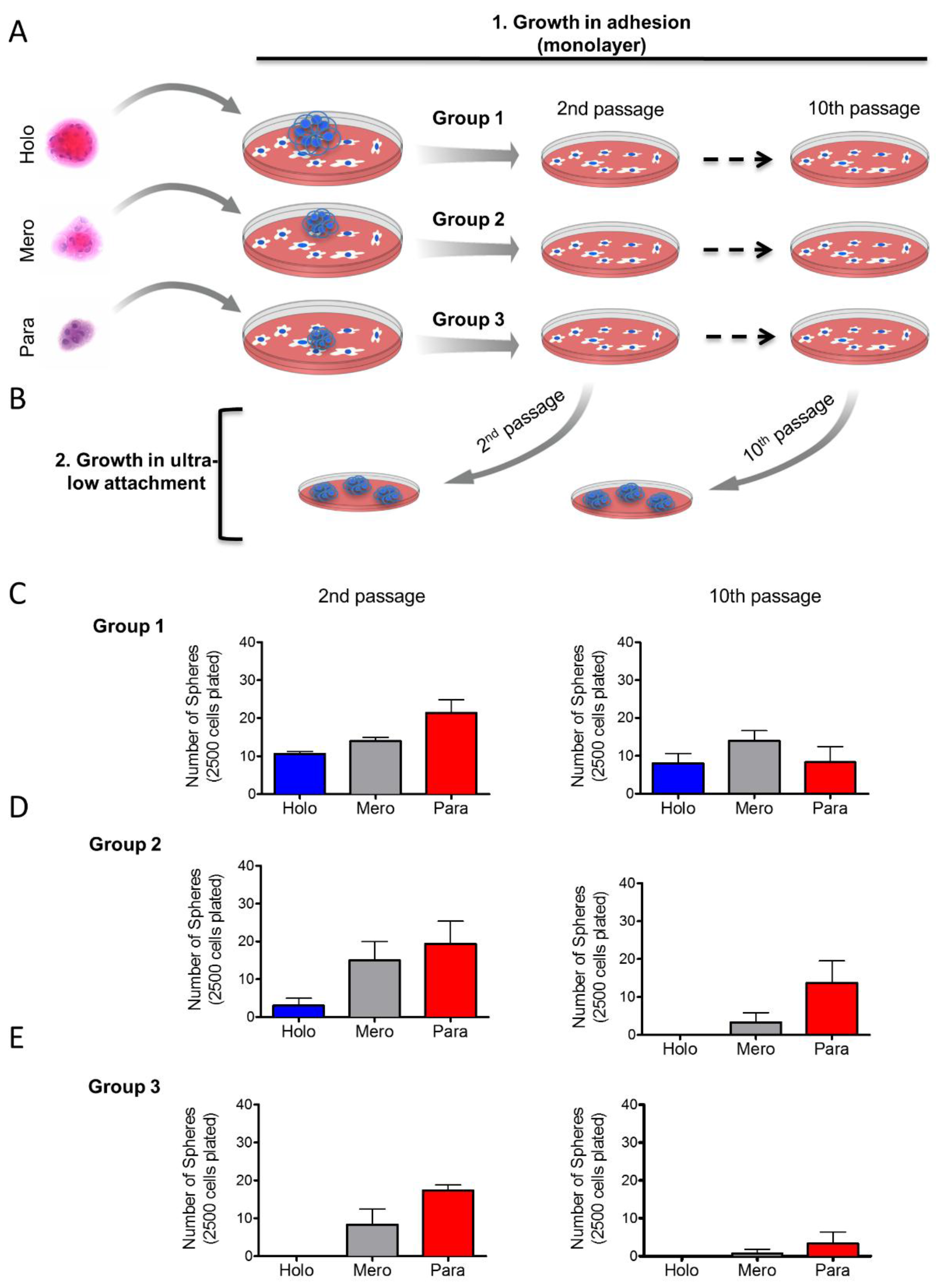 Long-term maintenance of CSC clonogenic potential. (A) Schematic representation of long-term culture of sphere-derived tumor cells under adhesion conditions. Tumor spheres from holospheres, merospheres, or paraspheres were isolated and seeded into culture in monolayer. Tumor cells from each group were maintained in monolayer culture for up to 10 passages; (B) Schematic representation of tumor cells derived from groups 1, 2, and 3 isolated from passages 2 and 10 and seeded into ultra-low adhesion culture dishes; (C) Tumor cells from group 1 (initially derived from holospheres) regenerate holospheres, merospheres, and paraspheres by passages 2 and 10; (D) Tumor cells from group 2 (initially derived from merospheres) only generated holospheres by passage 2 but failed to generate holospheres by passage 10; (E) Tumor cells from group 3 (initially derived from paraspheres) do not regenerate holospheres.