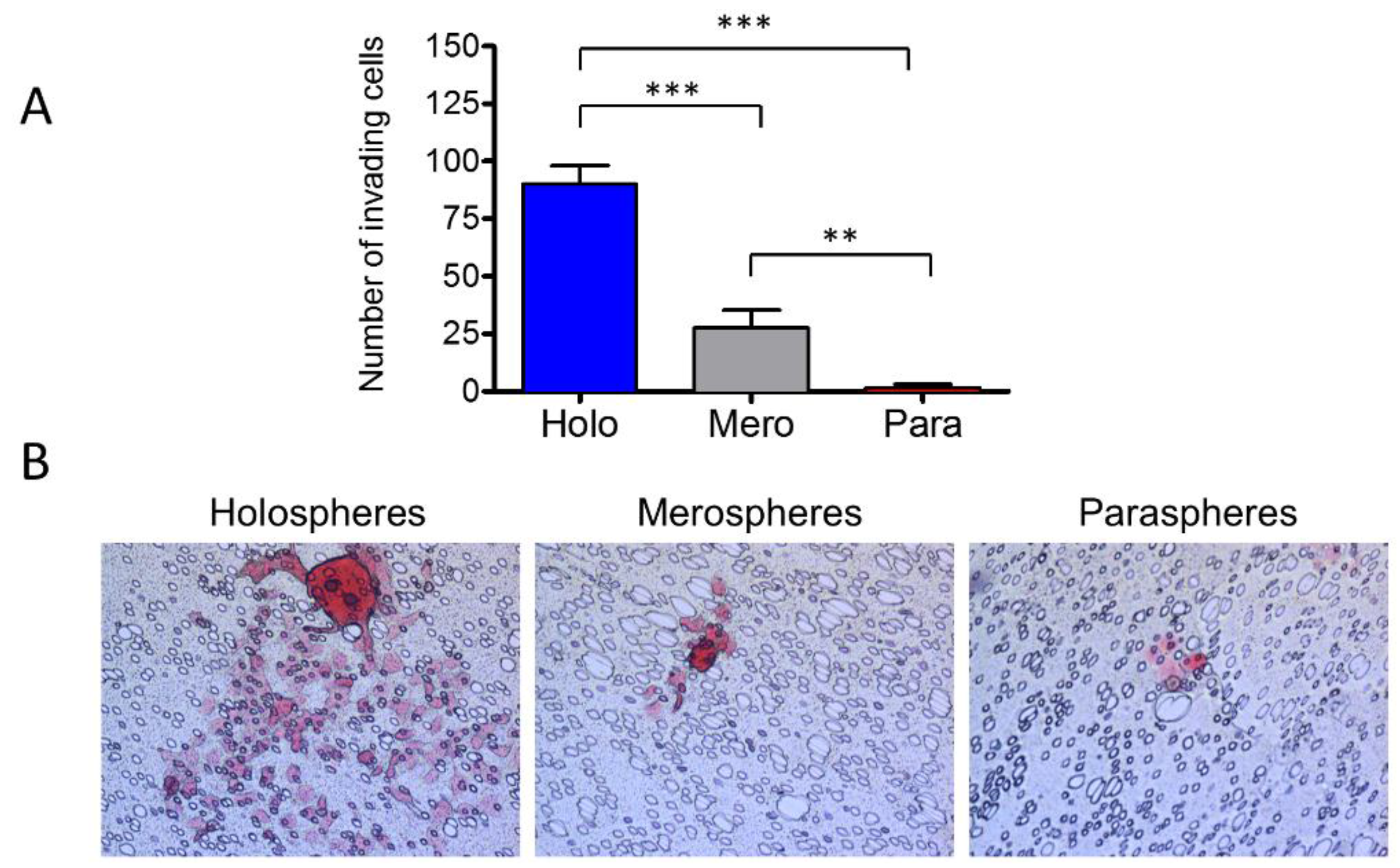 Holospheres have increased invasive potential. (A and B) Invasion assay of tumor spheres derived from holospheres, merospheres, and paraspheres. Holospheres show increased invasion compared to merospheres (*** p < 0.001) and paraspheres (*** p < 0.001). Merospheres invade significantly more than paraspheres (** p < 0.01).
