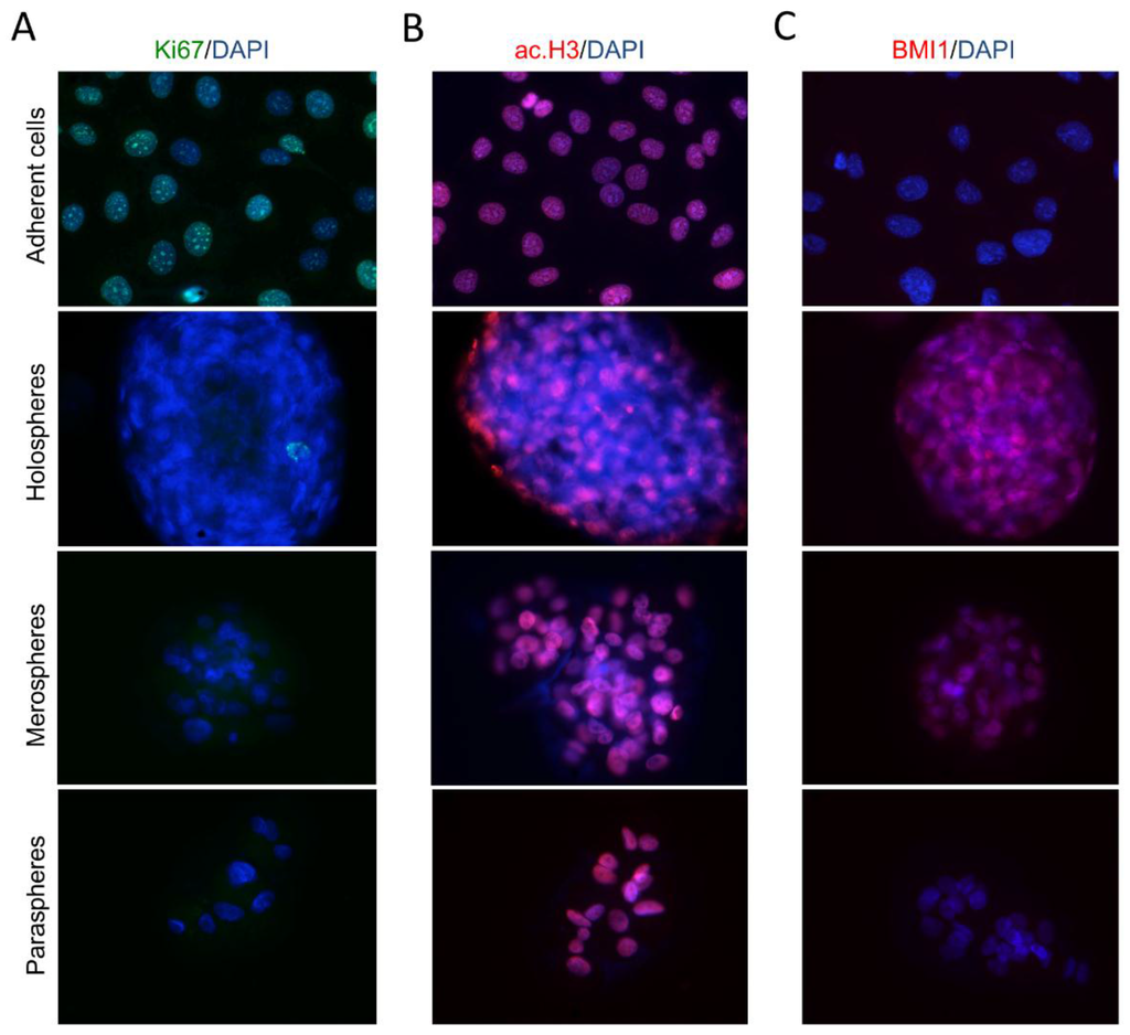 Tumor spheres present reduced proliferation and express stem cell hallmarks. (A) Proliferation of tumor spheres is reduced compared to tumor cells growing in adherent conditions (magnification × 200); (B) Histone acetylation of tumor spheres. Holospheres have reduced histone acetylation compared to merospheres, paraspheres and tumor cells growing in adherent conditions (magnification × 200); (C) Unlike paraclones and tumor cells growing in adhesion, holospheres and merospheres express BMI-1 (magnification × 200).