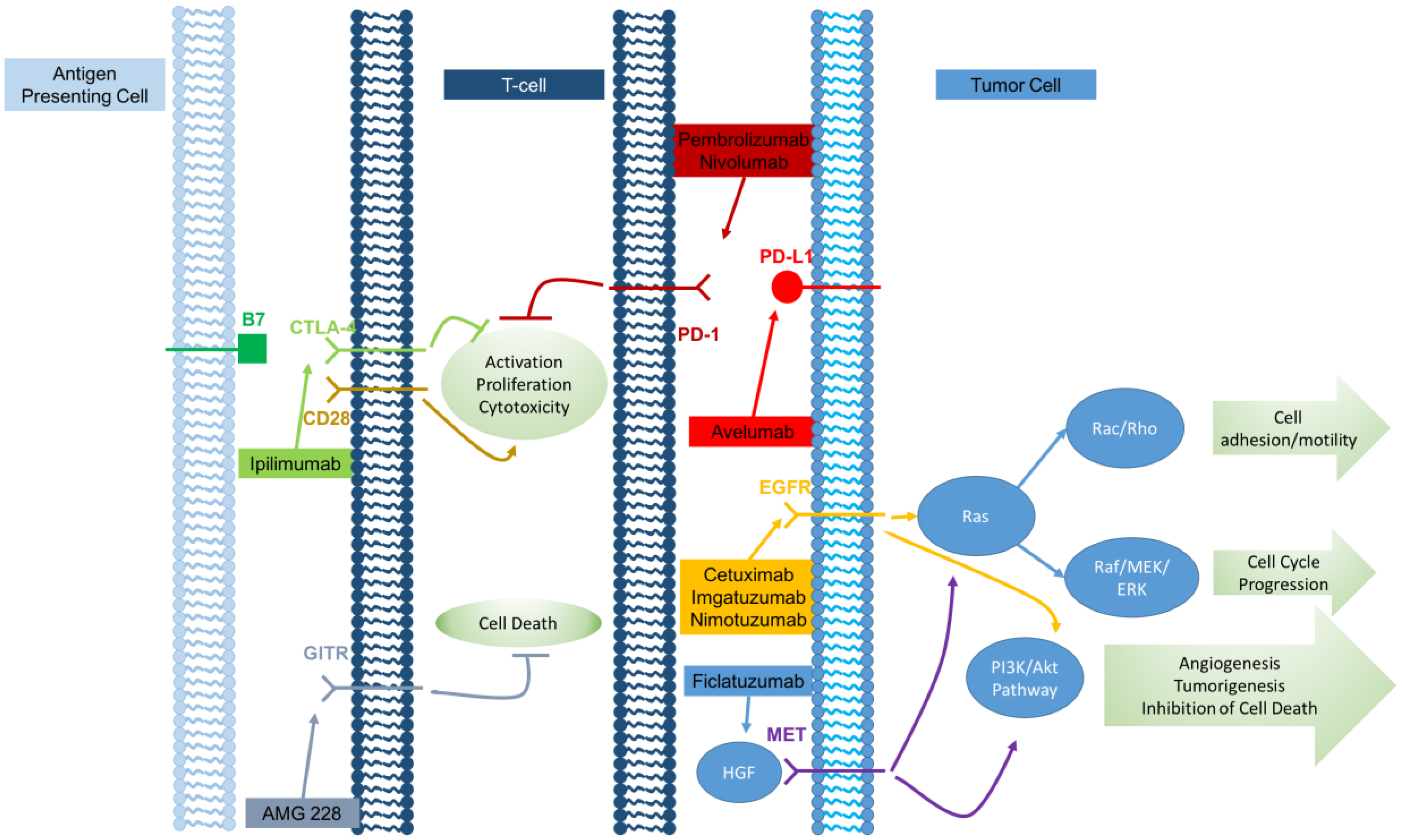Over recent years, an increasingly diverse group of monoclonal antibodies have been applied to cancer therapy, representing a significant advance in cancer treatment. Although these antibodies target a range of molecules, many antibodies mediate their antitumor effects through similar mechanisms including the targeting of tumor cells for antibody-dependent cell-mediated cytotoxicity (ADCC), the direct inhibition of tumor growth signals, and inhibiting signaling pathways involved in maintaining immune self-tolerance. Figure 1 graphically depicts the various monoclonal antibodies and where they act along the immune pathway.