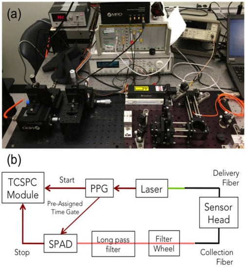 Figure 1 shows a photograph and schematic of the experimental setup. The pulsed laser was coupled into the delivery fiber. The laser also outputs an electrical signal that is sent to a programmable pulse pattern generator (PPG) (Agilent 81110A, Keysight Technologies, Inc., Santa Rosa, CA, USA). Each pulse generates outputs on two separate channels, each with pulse shape designed to match the intended input. The first output is a single pulse sent to the “start” channel of the time-correlated single-photon counting (TCSPC) module (HydraHarp, PicoQuant GmbH, Berlin, Germany), while the second is a pattern of pulses sent to the SPAD control module. The SPAD is turned on for a preassigned time, only when the control module receives a pulse from the PPG.