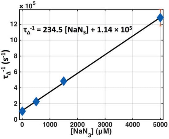 In order to experimentally determine the photophysical parameters of the spontaneous phosphorescence rate of 1O2 to 3O2 (k6) and the bimolecular reaction rate of 1O2 with the substrate (k7) in Photofrin phantoms, photosensitizer triplet-state and singlet oxygen lifetime measurements were obtained using the SOLD system. Varying amounts of the singlet oxygen quencher, sodium azide (NaN3), were added to the Photofrin–MeOH solutions. The resulting fits to obtain k6 and k7 are shown in Figure 2. For Photofrin with NaN3, k6 was found to be 1.14 × 105 s−1 (the intercept of the line of best fit in Figure 2) and k7 was found to be 235 μM−1·s−1 (the slope of the line of best fit in Figure 2). k7 is pH-dependent, but is in the range of the reported value of 300–400 μM−1·s−1 for the quenching rate constant in water []. These values were used to calculate τ∆ for the in vitro condition (without NaN3) and the in vivo condition (taken from the literature for biological tissue []). Assuming that k7 for NaN3 is greater than or equal to that of in vivo conditions (assuming biological tissue is less efficient than NaN3 in quenching 1O2), it can be estimated that in vivo acceptor concentration [A] ≥ 107 (s−1)/235 mM−1·s−1 = 42 mM. This value is much higher than [A] = 0.83 mM in the literature [], but we feel that it is more reasonable since the singlet oxygen lifetime in vivo, τ∆, does not change for reacted singlet oxygen concentrations [1O2]rx as high as 12 mM [], indicating there are still plenty of acceptors in vivo at this level.