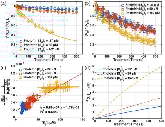 Figure 3a,b show the measured [3O2] and [S0] at just below the surface (d = 0) versus time in an Intralipid phantom (with μs’ = 0.2 cm−1) for three different initial Photofrin concentrations (27, 50, 167 mM). The symbols are measured values and the lines are SOED-calculated results. Figure 3c shows the PS photobleaching rate per PDT dose,  versus [S0]. The symbols are calculated values using Equation (7), and the line is the best linear fit. Figure 3d shows the expected SOED-calculated cumulative reacted singlet oxygen concentration, [1O2]rx, during illumination.
