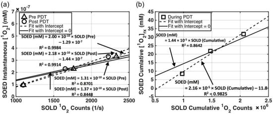 It can be concluded from the intercomparison of SOED and SOLD in Photofrin solutions (Figure 5b) that the cumulative SOLD [1O2] counts, [SOLD], and SOED-calculated [1O2]rx values track each other very well (R2 = 0.98) for Photofrin, with a conversion factor of the following form: