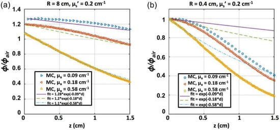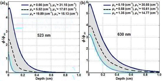 The ratio of φ and in-air fluence rate (φair) versus tumor depth for (a) 523 nm and (b) 630 nm optically broad laser beams on an air–tissue interface using an analytical formula that fits MC simulation [,,,] and optical properties obtained in in vivo MPM patients (Figure 4).