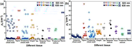 (a) Tissue μa’ and (b) μs’ at 523 (hollow symbols) and 630 (filled symbols) nm measured in vivo in malignant pleural mesothelioma (MPM) patients.