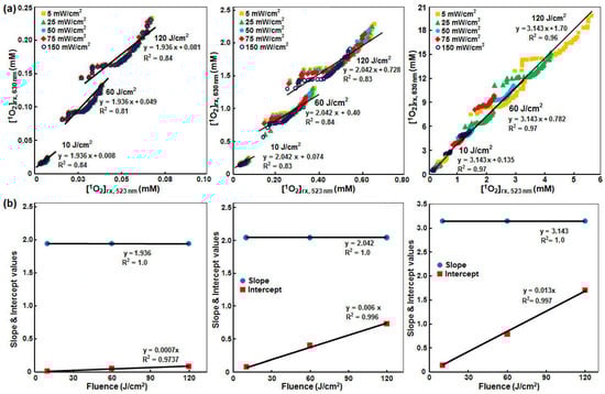 (a) [1O2]rx calculated at 630 nm and 523 nm for different total fluence (φ = 10, 60, 120 J/cm2) for mean Photofrin concentrations (c) of (from left to right) 0.21, 2.1, and 21 μM. Absorption and scattering coefficients were obtained at the two wavelengths from Figure 6. SOED calculation of [1O2]rx used Equations (5) and (6) and averaged over a 1 cm depth and 1 cm3 volume using photophysical parameters listed in Table 1 for the in vivo conditions; (b) Slope and intercept of the correlation of [1O2]rx at 630 nm and 523 nm as a function of fluence and PS concentration.
