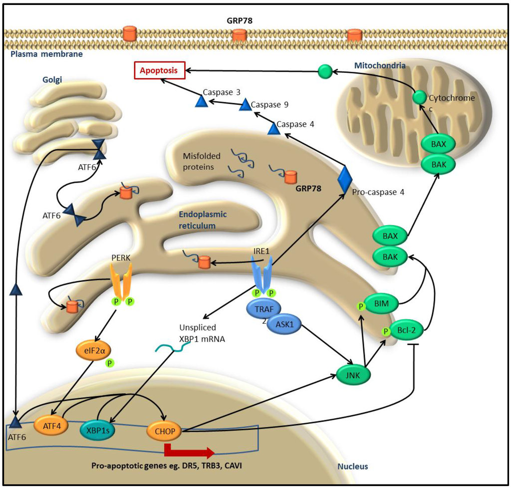 On failing to resolve ER-stress, UPR-induced apoptosis is activated by both PERK and IRE1 cascades and the direct activation of caspase-12. Prolonged ER stress leads to PERK phosphorylating eIF2α and inducing ATF4 expression that in turns results in the up-regulation of CHOP, a transcription factor that stimulates the expression of several pro-apoptotic genes (Figure 2) [34,35]. Increased expression of CHOP by the UPR results in decreased Bcl-2 (apoptosis regulator Bcl-2) levels and translocation of Bax (Bcl-2 antagonist of cell death) to the mitochondria to induce apoptosis [36]. In this way, the UPR is able to mediate apoptosis through well characterised apoptotic signaling pathways that result in mitochondrial membrane disruption. Acute ER-stress and activation of IRE1 signaling can relocalise Bak and Bax (Bcl-2 antagonist of cell death) to the mitochondria to propagate apoptosis [37]. Activation of IRE1 in response to prolonged ER-stress will induce apoptosis via recruitment and phosphorylation of TRAF2 (TNF-associated receptor factor 2) that activates JNK through the ASK1 signaling cascade (Figure 2) [38]. Protein kinase JNK, then promotes mitochondrial-dependent apoptosis involving unknown downstream targets. Caspase-12 (human ortholog caspase-4) is itself a critical effector in UPR apoptosis, indeed null caspase-12 mutants have reduced sensitivity to ER-stress induced apoptosis [39]. Pro-caspase-12 resides in the ER-membrane and when prolonged, acute ER-stress is present, phosphorylated IRE1 cleaves caspase-12 initiating the caspase cascade cleaving caspase-9 then caspase-3, eventuating in apoptosis [40]. The ability to bypass classical apoptotic cascades is of particular interest for cancer research. Oncogenic mutations render the cells resistant to apoptotic mechanisms, therefore this particular UPR-induced apoptosis could provide a valuable form of therapy.