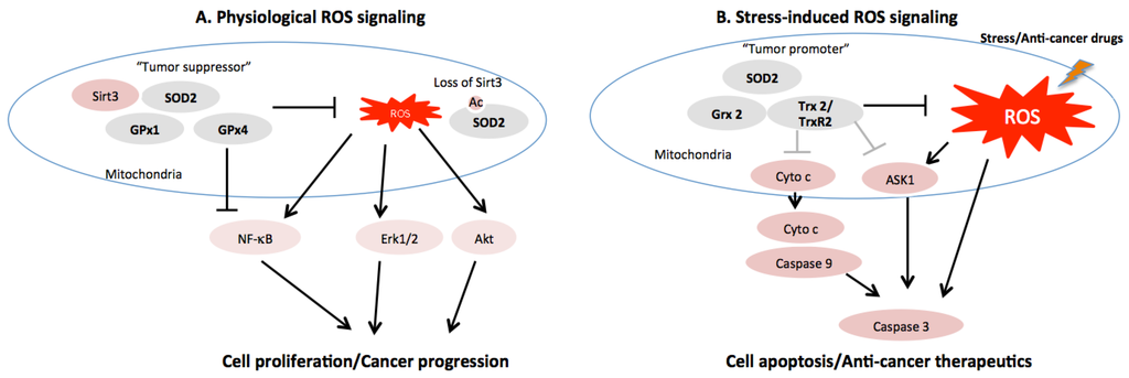 The redox signaling pathways of several key mitochondrial antioxidant systems and their roles in cellular apoptosis and proliferation. (A) Basal mitochondrial ROS activate cell survival and proliferation signaling to promote cancer progression. Mitochondrial anti-oxidant proteins could scavenger basal ROS and function as “tumor suppressors”. Deacetylase Sirt3 deacetylates SOD2 and enhances its activity. Loss of Sirt3 promotes oncogenesis, in part, by diminishing SOD2 activity; (B) Tumor micro-environmental stresses such as cytokines and anti-cancer drugs stimulate excessive ROS to activate apoptotic signaling. Under these settings, the mitochondrial anti-oxidant proteins could limit excessive ROS-induced apoptosis to act as “tumor promoter”.