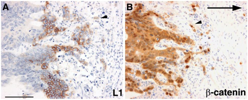 L1 is expressed in colorectal cancer (CRC) cells at the invasive edge of the tumor tissue in cells expressing nuclear β-catenin. (A) CRC tissue immunostaining for L1; (B) A serial section of the same area immunostained for β-catenin. Note the membranal staining with L1 antibody while β-catenin is stained both in the cytoplasm and in the nuclei of cells indicative of active Wnt signaling. The large arrow points to the direction of invasion. The small arrowheads point to a single invading CRC cell expressing L1 and nuclear β-catenin (from reference 30). The bar represents 75 μm.