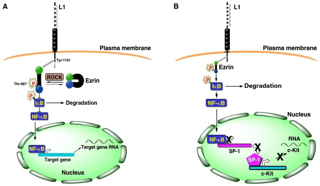 Schematic representation of L1-mediated signaling that involves ezrin and NF-κB. (A) Ezrin is activated by phosphorylation on threonine 567 (Thr-567) by ROCK that enables its association with the cytoplasmic tail of L1 involving tyrosine 1151 (Tyr-1151). The relocalization of ezrin in complex with L1 is involved in the recruitment of IκB to this complex, its enhanced phosphorylation and degradation by the proteasome followed by the release of NF-κB to migrate into the nucleus and activate target genes; (B) The L1-ezrin-NF-κB signaling is also employed in the inhibition of c-Kit transcription, indirectly, by the blocking of SP-1 transcription by NF-κB (modified from references [39,41]).