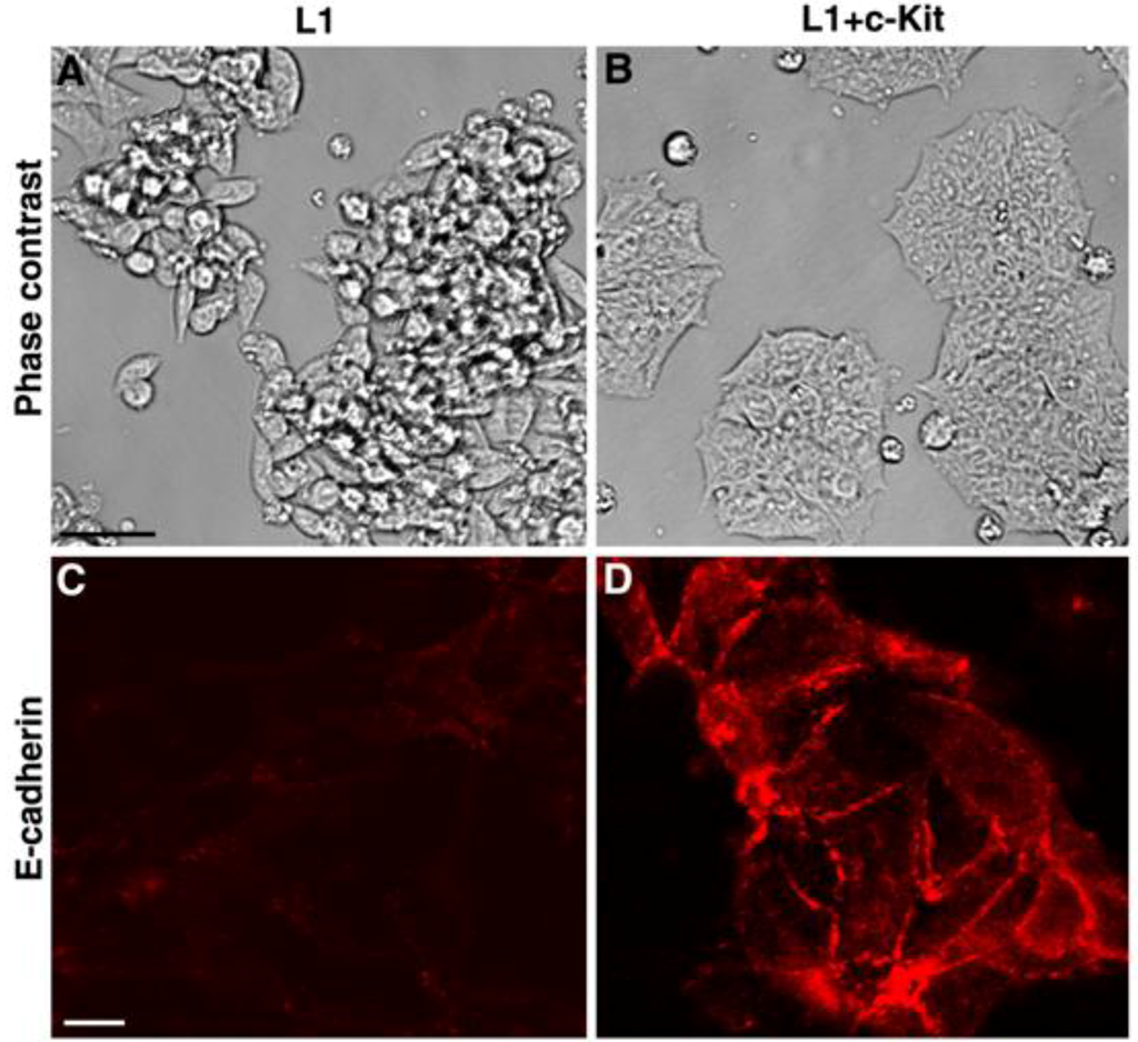 The expression of c-Kit in CRC cells induces a mesenchymal to epithelial conversion. (A) L1 expressing Ls174T CRC cells are organized in small three-dimensional aggregates; (B) The transfection of c-Kit into such cells results in cell spreading and a more epithelial-like organization of cells; (C) The L1 transfected CRC cells do not express significant levels of E-cadherin; (D) Transfection of c-Kit induces E-cadherin expression and organization at cell-cell contacts (modified from reference [42]). The bar represents 20 μm.