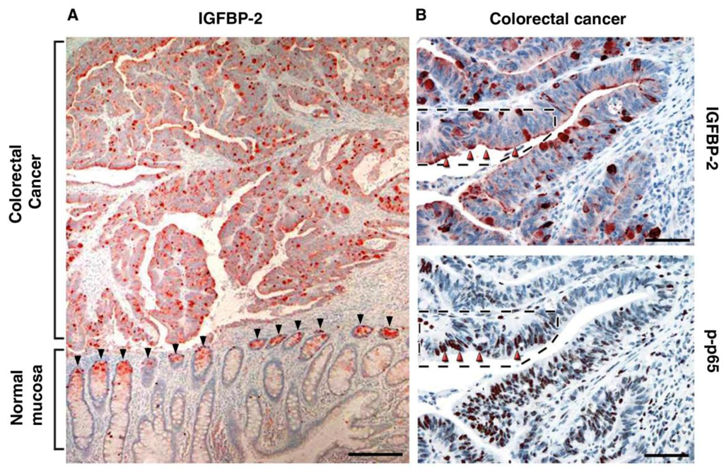 The localization of IGFBP-2 in CRC tissue. (A) Human CRC tissue was immunostained for IGFBP-2. The tumor tissue was strongly stained for IGFBP-2 throughout the tissue, while the adjacent normal colonic crypts were exclusively stained at the bottom of colonic crypts (black arrowheads); (B) Serial sections of human CRC tissue were immunostained for IGFBP-2 and the activated form of the NF-κB subunit p-p65. Note the colocalization of p-p65 in the nuclei of CRC cells together with IGFBP-2 in the membrane of the same cells (red arrowheads). The bar represents 250 μm.