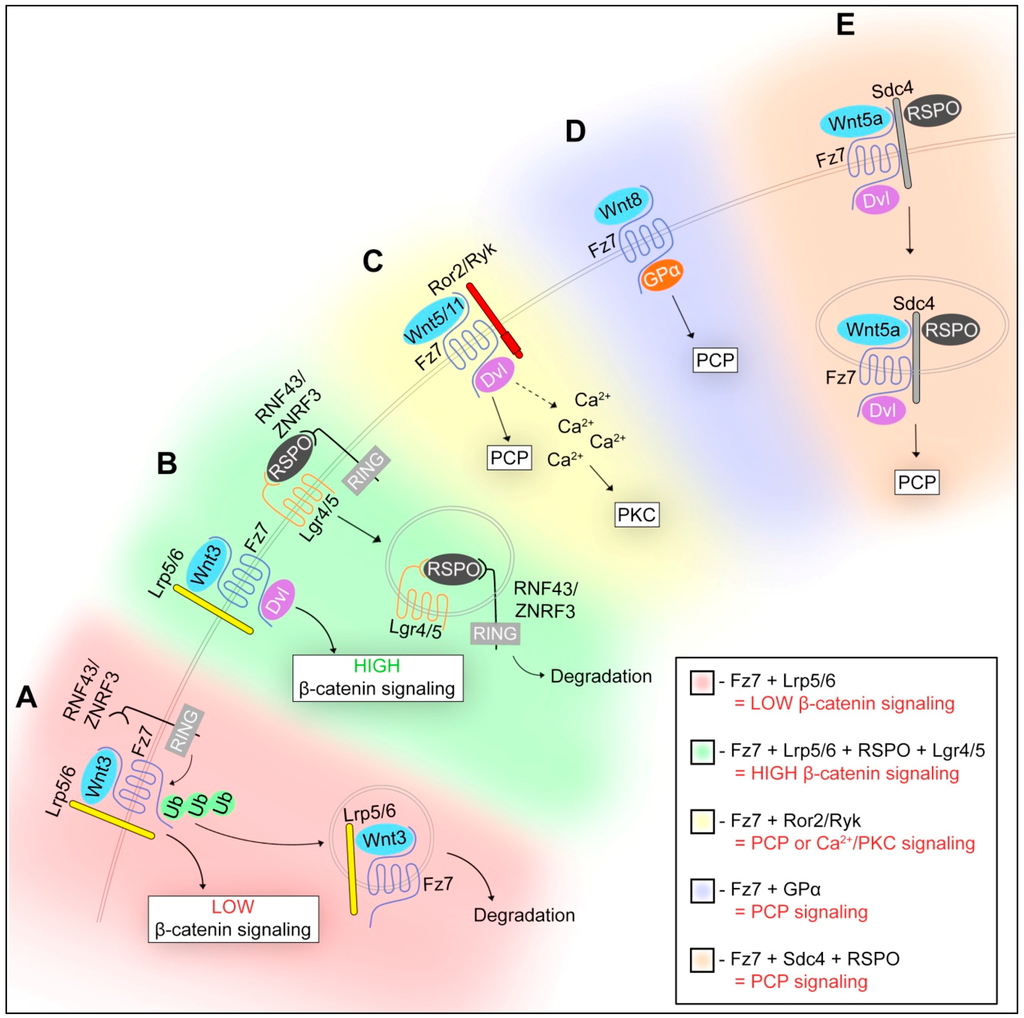 Fzd7 receptor complexes and signalling output. (A) Fzd7 (Fz7) can associate with Lrp5/6 to transmit canonical Wnt signaling from ligands including Wnt3. However RNF43/ZNRF3 ubiquitylates Fzd7 and targets it for internalisation and protesomal degradation, thus resulting in turn-over of the receptor complex and low canonical Wnt signaling; (B) In the presence of Lgr4/5, and RSPO it is RNF43/ZNRF3 which is internalised and degraded and thus Fzd7/Lrp5/6 remains on the cell surface to transmit Wnt signalling and canonical signalling output is high; (C) Fzd7 can associate with Ror2 or Ryk to transmit non-canonical Wnt signals from ligands including Wnt5 or Wnt 11, either via PCP or Ca2+; (D) Fzd7 can associate with G Protein α (GP α) to transmit signals from Wnt8 via the PCP pathway; (E) Fzd7 can associate with Syndican4 (Sdc4) and R-Spo to transmit Wnt5a signals via internalisation of the whole receptor complex and ligand which then activates PCP signaling.