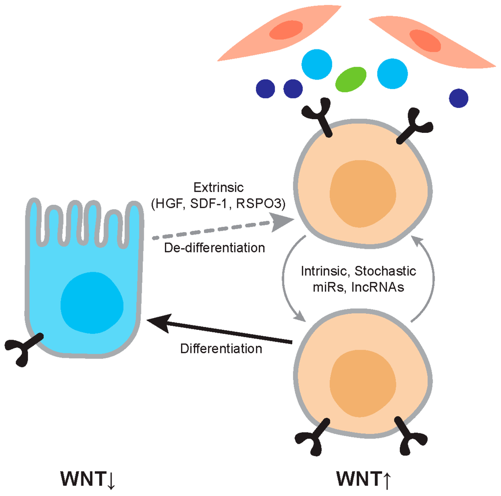 Regulation of Wnt activity in cancer. The figure depicts the relationship between differentiated tumor cells and cancer stem cells. Differentiated cells are relatively Wnt-low and cancer stem cells relatively Wnt-high. Wnt activity levels are dependent on extrinsic factors such as Hepatocyte Growth factor (HGF) and RSPO3, and on intrinsic factors such as mutation and expression levels of microRNAs (miRs). The cancer stem cell phenotype is not stable and differentiation and dedifferentiation are ongoing processes.