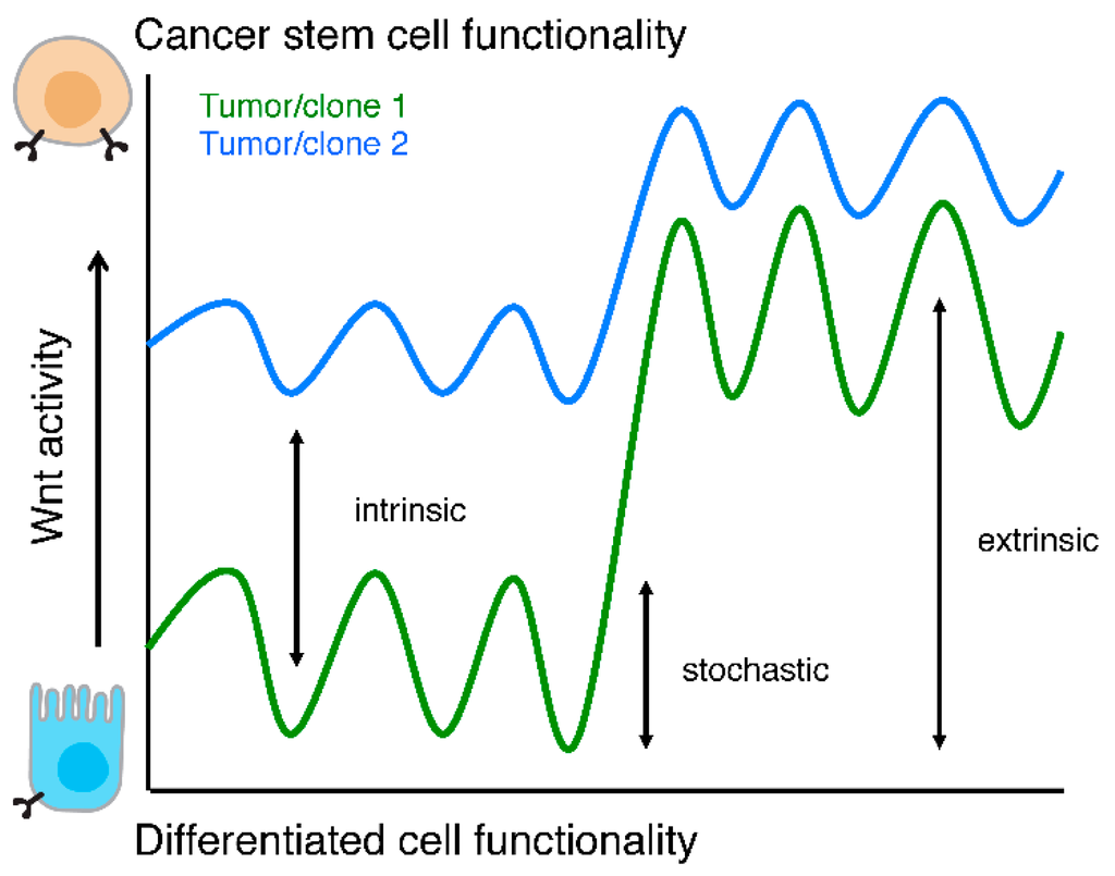 Wnt activity levels and functionality. Schematic representation of cellular functionality as a function of Wnt activity levels. Two tumors or clones are depicted (green and blue lines) to highlight that intrinsic Wnt activity levels, stochastic fluctuations, and responses to extra cellular stimuli are different between two (epi)genetically distinct populations.