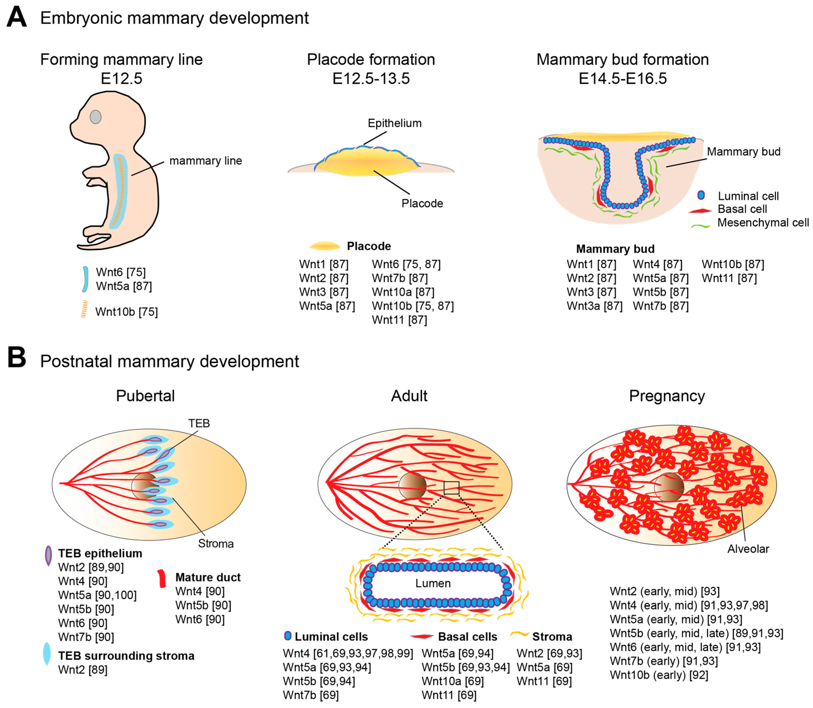 The expression of Wnts at various stages of mammary development. Expression pattern of Wnt members documented at key morphogenesis stages, including mammary line, placodes, and mammary bud formation during embryogenesis (A); and puberty, adult and pregnancy stages during postnatal development (B).