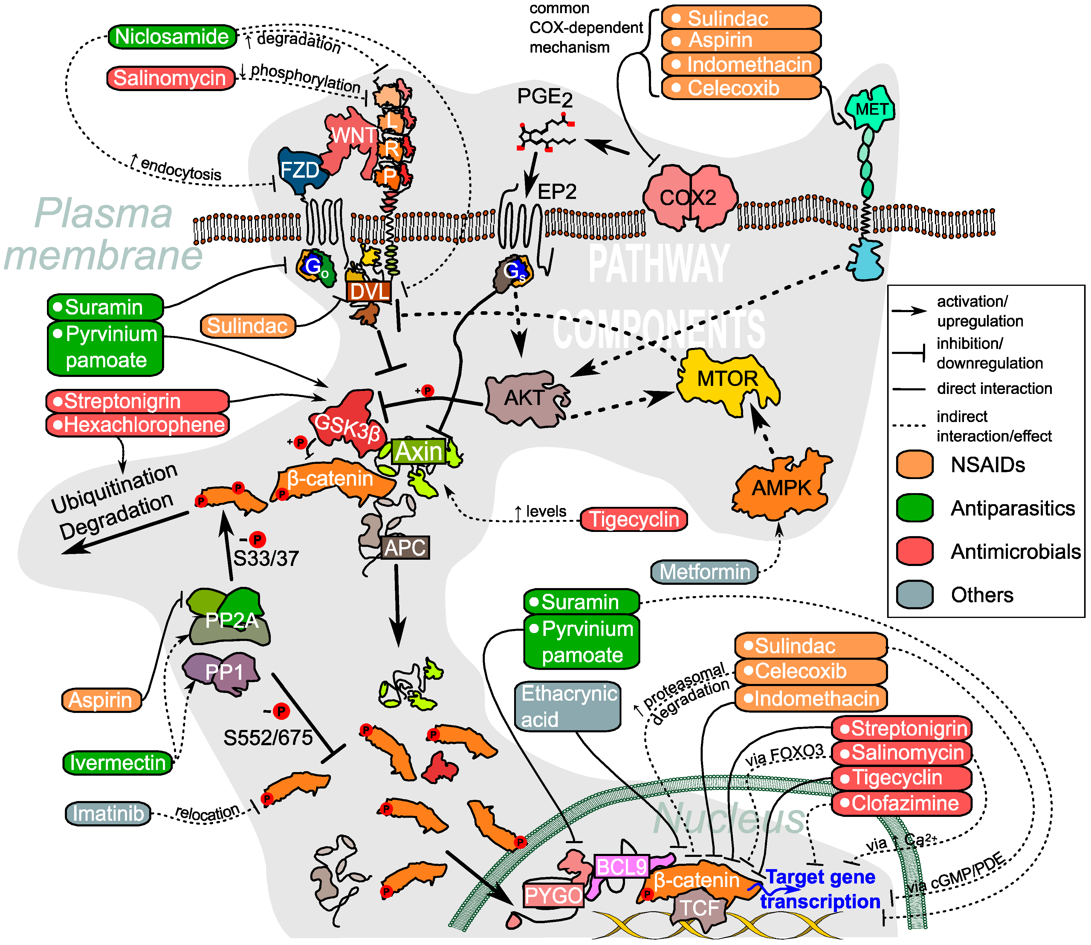- Identification of the molecular target is a complicated process, and it is frequently omitted by researchers. Out of the 16 drugs we reviewed here, only EA, suramin, sulindac, pyrvinium pamoate and indomethacin were shown to directly affect identified components of the WNT pathway. Additionally, metformin is known to affect WNT signaling via a cross-talk from its original target AMPK. Delaying the unequivocal identification of the novel molecular target makes it problematic to optimize the drug and evaluate of the scope of its anticancer applications.