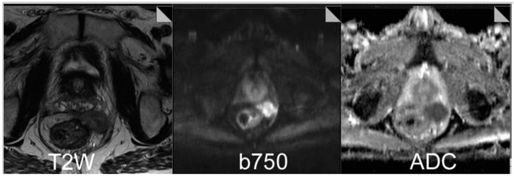 Figure 1. Restricted diffusion within rectal cancer with extension into the perirectal space. T2-weighted image demonstrate a well-circumscribed lesion in the perirectal space. Diffusion-weighted image obtained at a b value of 750 demonstrates a high signal, and corresponding ADC map demonstrates relatively restricted diffusion within the tumour. Figure reproduced with permission from Padhani et al. [24].