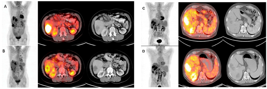 Figure 2. FDG-PET/CT images before (A and C) and 4 weeks after (B and D) 90Y-microsphere radioembolisation in liver-dominant mCRC; (A and B) The illustrated metabolic response was associated with a survival of 12 months after treatment; (C and D) This metabolic non-responder survived 5 months after treatment. Figure reproduced with permission from Sabet et al. [35].