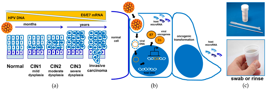 Figure 1. (a) Timeline of cervical cancer progression. Human papillomavirus (HPV) infects the basal cells of the cervical epithelium (dark blue) exposed by wounding, leading to cytological abnormalities; (b) Expression of viral oncogenes E6/E7 accompanies malignant transformation; (b) HPV infection pathway. Following viral entry, viral replication is synchronous with host cellular DNA replication. Integrated and episomal viral DNA produce E6 and E7 oncoproteins. E6 targets p53 for degradation and prevents apoptosis while E7 inactivates retinoblastoma (Rb) tumor suppressors, promoting cell cycle progression. The end result of these processes is cellular transformation. HPV infection also alters transcription of host microRNAs; (c) Samples for detection of HPV E6/E7 mRNA or host microRNA. CIN: cervical intraepithelial neoplasia.