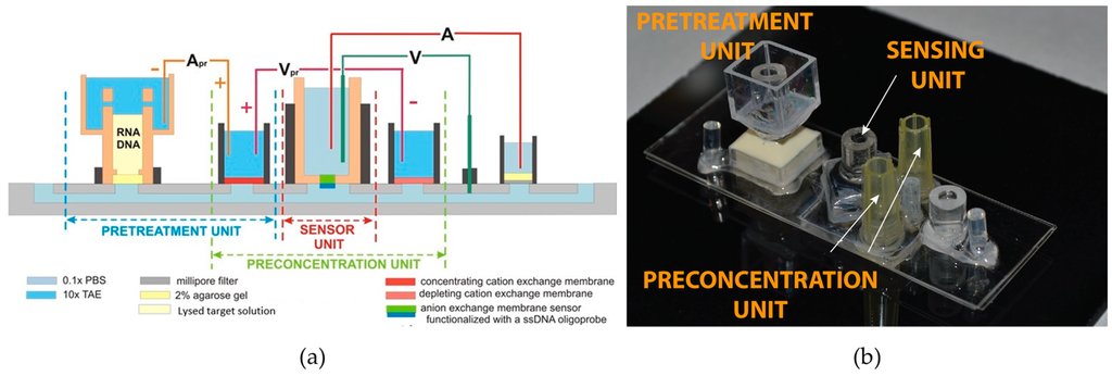 Downstream from a pretreatment unit was a pre-concentration unit consisting of a cationic exchange membrane. The goal of the pre-concentration unit was to form an ionic plug using electric field and block the passage of the extracted nucleic acids. This resulted in the accumulation of the extracted nucleic acids in a specific location thus improving the sensor sensitivity. The location of the concentrated molecules depended on the flow rate of target molecules in one direction opposed by the ionic plug force in the other direction [196].