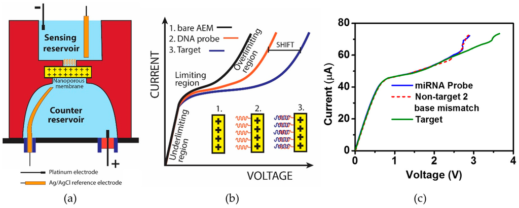 Figure 3. Sensing unit of the integrated platform. (a) Schematic showing the ion-exchange nanomembrane sensor; (b) Current-voltage characteristics (CVC) showing changes in ohmic, limiting and overlimiting regions for bare anion-exchange membrane (AEM; black), membrane functionalized with oligoprobe (red) and hybridization of DNA/RNA with oligoprobe (blue); (c) The specificity of the sensor was challenged by using a non-target sequence differing by only two base pairs compared to the target sequence. Change in CVC was only observed for the target miR sequence indicating the sensor’s capability to distinguish two-base-pair mismatches. Adapted with permission from [195].