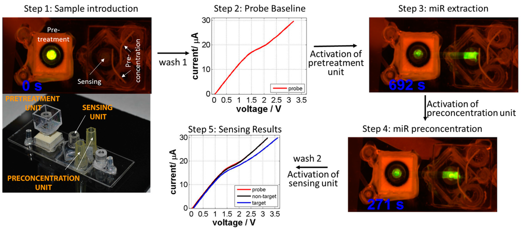 The integrated platform was constructed by combining these three components using low-cost polymeric polycarbonate materials, thus reducing the overall cost of the assay. The external circuitry eliminates any on-chip micro-electrode fabrication and hence reduces manufacturing challenges and cost. Another advantage of the platform is its modular design which allows for rapid prototyping of the different components. Oral cancer cell line samples were used to successfully verify the platform’s performance for the detection of target miR in under 45 min. Figure 4 illustrates the sequential operation of the sample pretreatment unit to extract nucleic acid biomarker and nanomembrane based pre-concentration/sensing unit to generate a shift in electrical signal upon presence of the target biomarkers. More importantly, repeating the five steps with a non-target resulted in no shift in I-V curve, confirming sensor’s selectivity [196]. This clearly demonstrated the ability of the entire platform to selectively detect short miR molecules from sample introduction to answer in an integrated fashion and can be easily extended for the detection of miR biomarkers associated with cervical and oropharyngeal cancers.