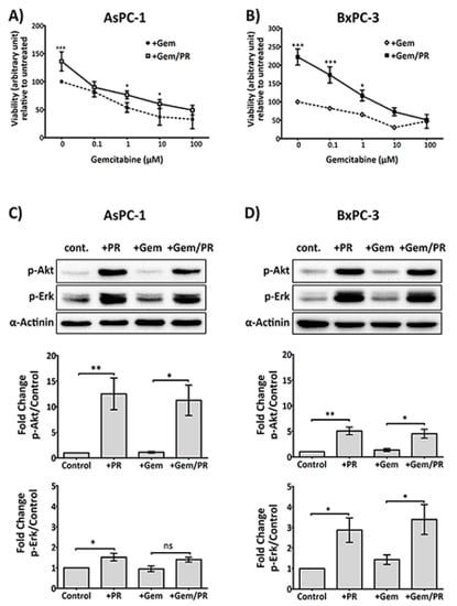 As shown in Figure 1C,D, platelet releasate triggered a significant upregulation of phosphorylation of the survival signalling molecules, p-Erk and p-Akt, in both AsPC-1 and BxPC-3 cells, which was unaffected by the presence of gemcitabine.