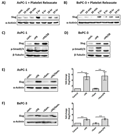PR induces a rapid upregulation of Slug, an EMT and chemotherapy resistance marker, independent of the TGFβ1/Smad pathway. Representative immunoblots (A) and (B) show Slug expression in AsPC-1 and BxPC-3 cells after time course treatment with platelet releasate (PR). 2 × 105 cancer cells per well were seeded in a 12-well plate for 24 h, serum starved for 6 h, then PR was added to the culture media (final concentration of PR was equivalent to releasate from 5 × 108 platelets/mL) for 10 min, 30 min, 2 h, 6 h, 18 h and 24 h. Representative immune blots (C) and (D) show Slug and pSmad2/3 expression in AsPC-1 and BxPC-3 cells after treatment with PR ± 10 µM SB431542 (TGFβ1 receptor inhibitor) or 0.1%DMSO (vehicle control, Sigma-Aldrich, St. Louis, MO, USA) for 2 h. Cell lysates were separated by SDS-PAGE and immunoblotted using specific antibodies for Slug (upper panel), p-Smad2/3 (middle panel) and loading control protein α-actinin or β-tubulin (lower panel). Each of the immunoblots (A)–(D) is representative of two independent experiments with similar results. Representative immune blots (E) and (F) and the associated bar graphs show Slug expression in AsPC-1 and BxPC-3 cells after 2 h PR ± gemcitabine treatment. The expression level of the protein of interest was quantified relative to the loading control. The graph columns represent fold changes in protein expression level compared to vehicle-treated cells (n = 4 for (E) and n > 3 for (F)). One way ANOVA with post.-hoc Bonferroni’s Multiple Comparison Test was used to examine the significance of the mean (** p < 0.001, * p < 0.05).