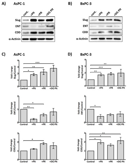 The effectiveness of gemcitabine relies on the function of several proteins, including the influx protein, ENT1 [35], deoxycytidine kinase (dCK) (phosphorylates gemcitabine into an active form) [66], and CDD (deactivates gemcitabine) [36,37]. In our hands, we observed a statistically significant upregulation of CDD expression in cancer cells cultured with platelet releasate (Figure 3), suggesting that soluble factors from platelets could increase the capacity of cancer cells to deactivate gemcitabine. Inversely, the expression of hENT1 was decreased, at a statistically significant level in AsPC-1 and a trend reduction in BxPC-3. Reduced hENT1 implies that a lesser amount of gemcitabine could be transported inside the cells, thus increasing cell survival. Interestingly, degranulated platelets were also capable of instigating a significant upregulation of Slug in the cancer cells, suggesting a physical interaction between the surface molecules of platelets and cancer cells could induce intracellular signalling down the EMT pathway. Similarly, Labelle et al. have previously observed that a direct contact between cancer cells and platelets can activate a nuclear factor kappa-light-chain-enhancer of activated B cells, Nf-κB, pathway and EMT-like transformation in cancer cells independent of platelet-released factors [10]. Although studies indicate a common pathway for Nf-κB and Slug in regulating EMT [67,68], currently it is still unclear which receptors are involved in this cascade, and more studies are required to understand this interaction better.