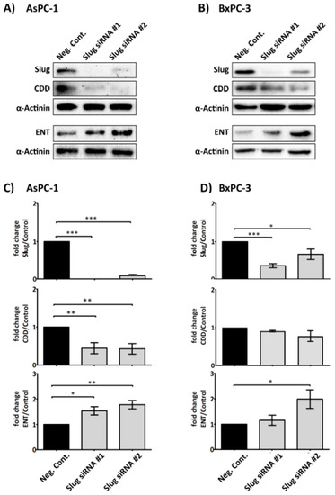 As platelet releasate was demonstrated to significantly increase Slug and alter the levels of CDD and hENT1 in PDAC cells, we next examined whether Slug is necessary for the modulation of CDD and hENT1 expression. A SLUG messenger RNA (mRNA) knockdown assay, using two different short interfering RNA (siRNA) sequences specific for SLUG mRNA and an irrelevant siRNA negative control, was performed to assess the changes in the expression of CDD and hENT1 in PDAC cells. Figure 4 clearly shows that the expression of CDD was significantly suppressed and, conversely, hENT1 was significantly increased in the absence of Slug in AsPC-1 cells. The protein expression change trends were also observed in the BxPC-3 cells, but the modulation was less pronounced and not statistically significant.