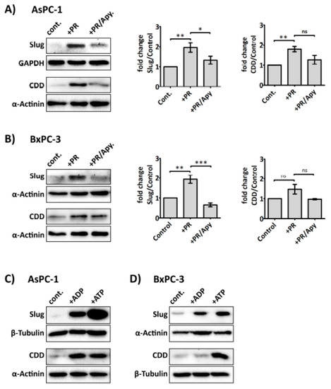Several purinergic receptors are reported to be expressed on cancer cells, including PDAC cells, ((e.g., P2Y1 and P2X7, which are adenosine diphosphate (ADP) and adenosine triphosphate (ATP) receptor, respectively)) [38,39]. More interestingly, recent studies suggest that purinergic signalling can promote invasiveness and EMT in prostate cancer cells [40,41]. Since ADP and ATP are secreted from activated platelets, and our above data indicated that platelet-derived soluble factors were responsible for modulating Slug and CDD expression, we next investigated whether the enzyme apyrase—which catalyses the hydrolysis of ATP and ADP—could ameliorate the effect of platelet releasate on Slug and CDD expression in PDAC cells. Our results show that apyrase (1 U/mL) significantly negated PR-induced upregulation of Slug and CDD in cancer cells (Figure 5A,B) but apyrase did not significantly modulate hENT1 expression level (Supplementary Figure S3). Exogenous ADP and ATP (100 µM) also increased the expression levels of Slug and CDD in PDAC cells (Figure 5C,D).