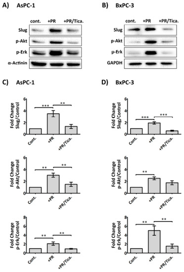 Anti-platelet drug ticagrelor, an antagonist of the purinergic receptor P2Y12 receptor, reduces the effects of PR on cancer cells. Representative immunoblots show Slug, p-Akt and p-Erk expression in AsPC-1 and BxPC-3 cells after incubation with PR ± ticagrelor (Tica, 10 µM) for 2 h. Sample preparations and immunoblotting were performed as previously described. The final concentration of PR used was equivalent to releasate from 5 × 108 platelets/mL. Bar graphs (C) and (D) show the expression levels of the proteins of interest relative to the loading control. Columns represent fold change in protein expression level compared to control non-treated cells. n ≥ 5. *** p < 0.0001, ** p < 0.001, ** p < 0.05. Data are presented as mean ± SEM. One way ANOVA with post-hoc Bonferroni’s Multiple Comparison Test was used to examine the significance of the mean. cont.: control.
