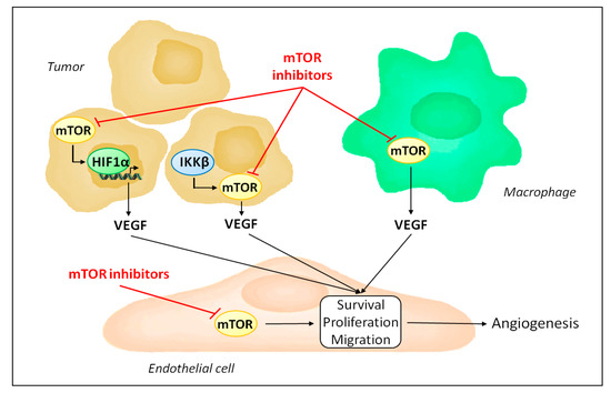 mTOR is ubiquitously expressed and its inhibition is not limited to endothelial cells. Accordingly, besides acting directly on endothelial cells, mTOR inhibitors influence angiogenesis by regulating the production of pro-angiogenic factors (Figure 2). Indeed, mTOR participates in the hypoxic tumor response by stabilizing hypoxia-inducible factor 1α and serves as a signaling intermediary in inflammation-mediated angiogenesis [63,64,65,66,67]. Consequently, mTOR inhibitors reduce the expression of VEGF [40,55].
