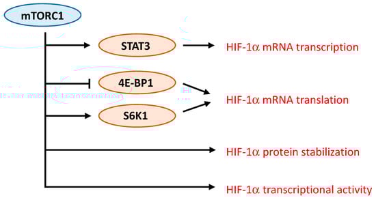 Several studies have demonstrated the complex interaction between mTORC1 and HIF-1α. Different mechanisms responsible for the regulation of HIF-1α by mTORC1 have been proposed (Figure 3). For instance, in prostate cancer cells, rapamycin decreases protein levels of HIF-1α by interfering with processes that promote HIF-1α protein stabilization [63]. In contrast, activation of HER2 receptor in breast cancer cells increases HIF-1α synthesis via stimulation of HIF-1α mRNA translation in a rapamycin-sensitive manner [68]. Up-regulation of HIF-1α mRNA translation was further observed either as a result of increased cap-dependent translation following 4E-BP1 phosphorylation or via ribosomal protein S6 kinase-1 [69,70]. An additional mechanism involves the promotion of the transcriptional activity of HIF-1α by mTORC1 [71]. Finally, more recently, one study specifically addressed the mechanisms driven by mTORC1 that induce HIF-1α signaling [72]. The role of mTORC1 and its downstream substrates 4E-BP1 and S6K1 in regulating HIF-1α mRNA translation was confirmed. In addition, the regulation of HIF-1α mRNA transcription by mTORC1 was demonstrated, and appears to involve STAT3 [72].