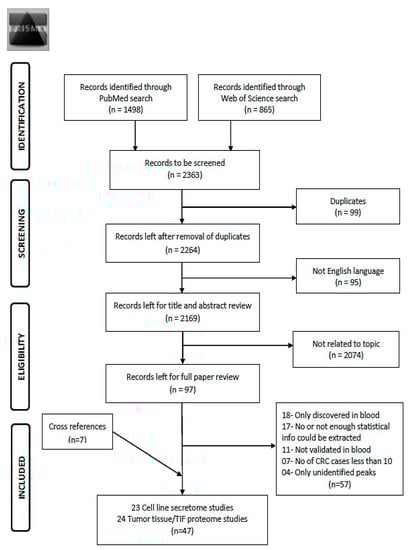 In recent years the secretome from conditioned media of cell culture and the tumor tissue proteome have turned out to be interesting and informative sources for markers associated with early diagnosis of CRC. The cell line secretome and tumor tissue proteome comprise all proteins shed, secreted or leaked from the cancer cells [15,16]. These secreted or leaked proteins are likely to end up in the systemic blood circulation and even though concentrations may be low, they have a high potential for serving as candidate diagnostic markers. The aim of this systematic review is to provide an overview of studies that investigated the diagnostic potential of proteins from the cell line sercretome and/or tumor tissue and validated those markers in blood from CRC patients and controls.